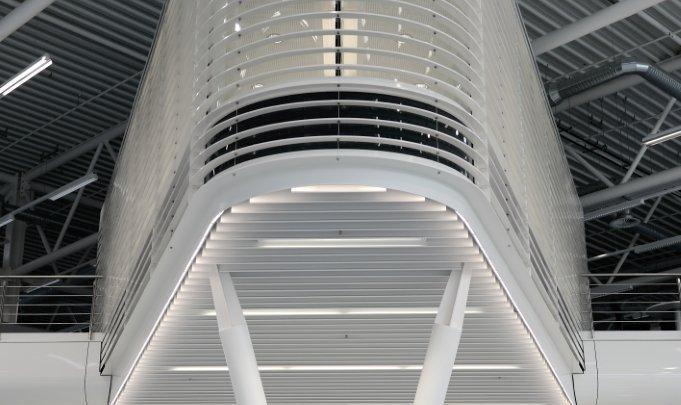 wpw plante einen offenen und transparent wirkenden Baukörper, der durch eine stark horizontal gegliederte Glasfassade überzeugt und zugleich mit fließenden Raumstrukturen die Kommunikation und Inspiration fördert. Zentrales Element und zugleich Blickfang ist der im Raum schwebende keilförmige Besprechungsraum. Ein weiteres Highlight ist die „Power Wall“. Sie dient zum globalen Echtzeit-Austausch digitaler Entwürfe. Es wurde übergreifend eine Arbeitsumgebung geschaffen, die Kreativität, Technologie und Designkultur auf einzigartige Weise verbindet.